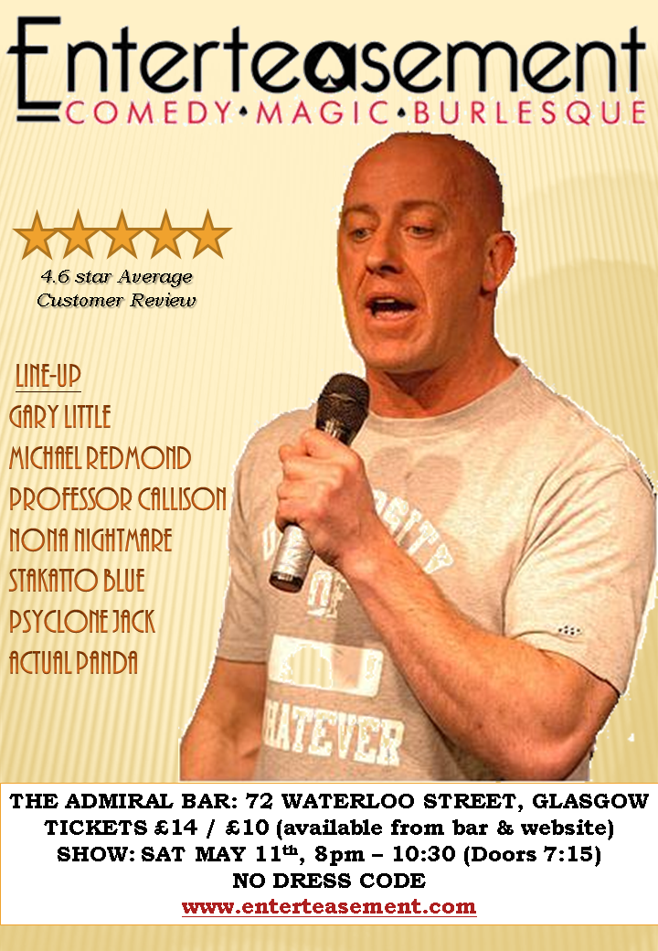 Poster for May show with Headline Act, Gary Little and full line-up of Comedians, magician and burlesque