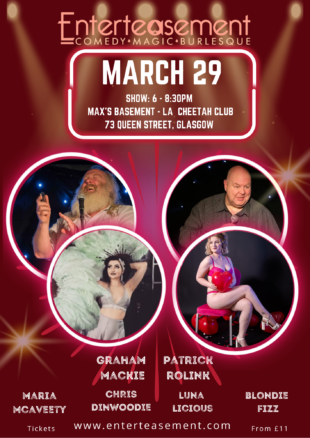 Are you looking for a good night out with the something different factor? Well Enterteasement’s award winning comedy, magic and burlesque show is perfect for you! What’s more, this show is extra special, because not only is it part of The Glasgow International Comedy Festival, after 15 years it’s our last show.